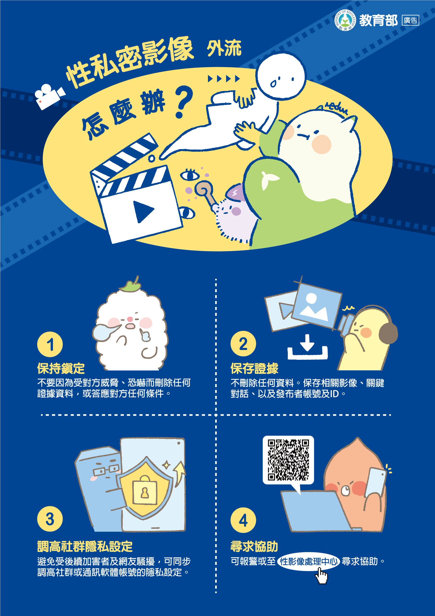 依據教育部「學校處理數位/網路性別暴力事件指引」,內容包含法律依據、進行相關通報、校內防治保護及校外資源連結。如他人或自己遭遇私密照被散布時,可向性影像處理中心線上申訴,或撥打私ME專線(02-66057373)申訴協助移除影像;並可同時通報警方或向社政單位求助(113專線或「社會安全網-關懷e起來」線上諮詢)。