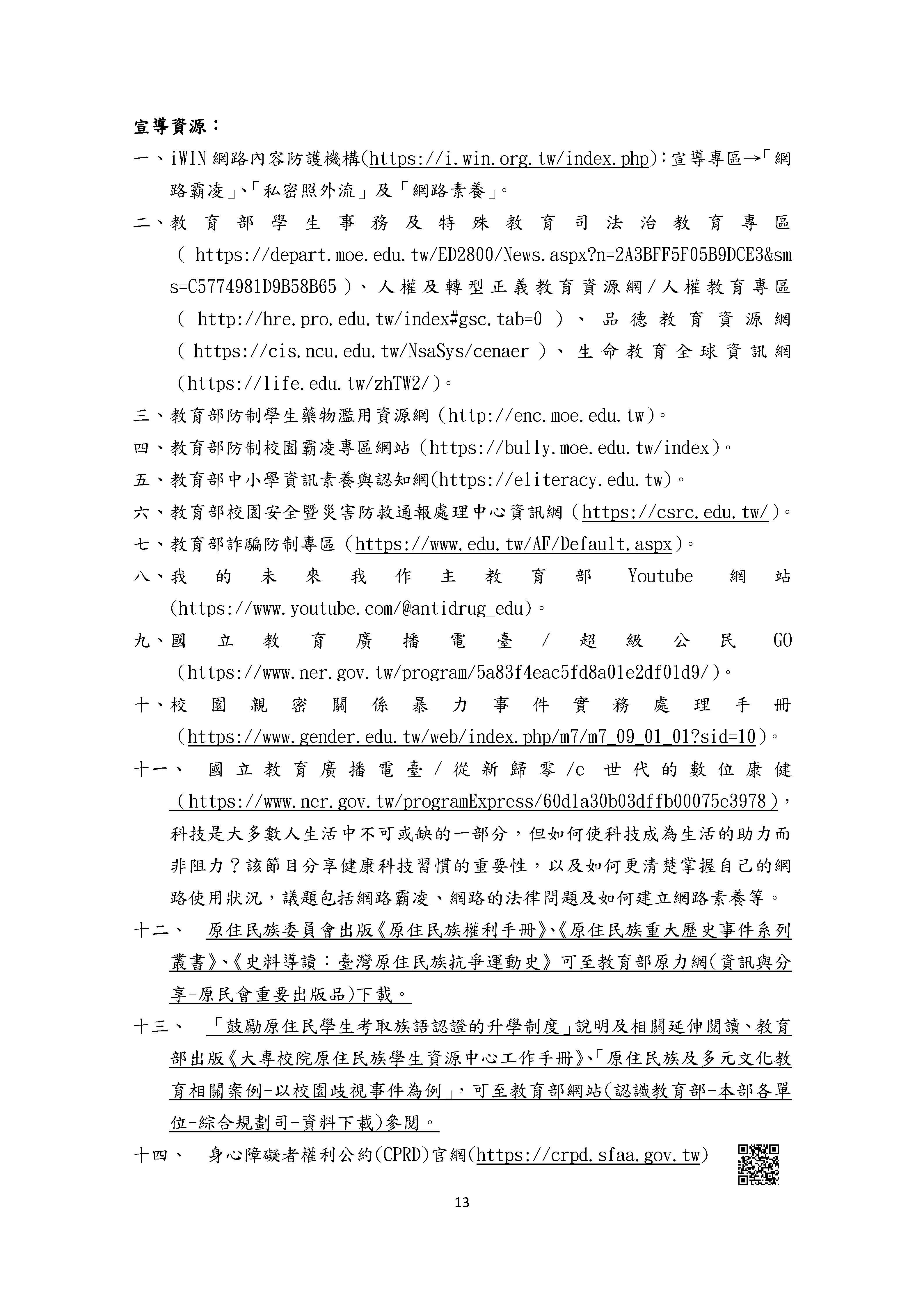 教育部113學年第2學期友善校園宣導主題-「拒絕兒少性剝削-不拍、不傳、不留、要求助」,建立尊重他人隱私尊重多元文化的理念,拒絕性別暴力,拒絕校園歧視,讓每一個孩子,都應該享有平等與尊重的教育環境,置重點「加強校園霸凌防制宣導」、「強化校園安全防護措施」、「強化學生身心健康與輔導」、「強化校園自殺防治工作」、「防制學生藥物濫用」、「防治校園親密關係暴力事件」、「瞭解與尊重身心障礙者」、「防治數位/網路性別暴力」、「配合執行跟蹤騷擾防制法」、「防制校園詐騙」、「交通安全宣導」、「尊重多元文化理念」及「加強推動全面性教育」之宣導。