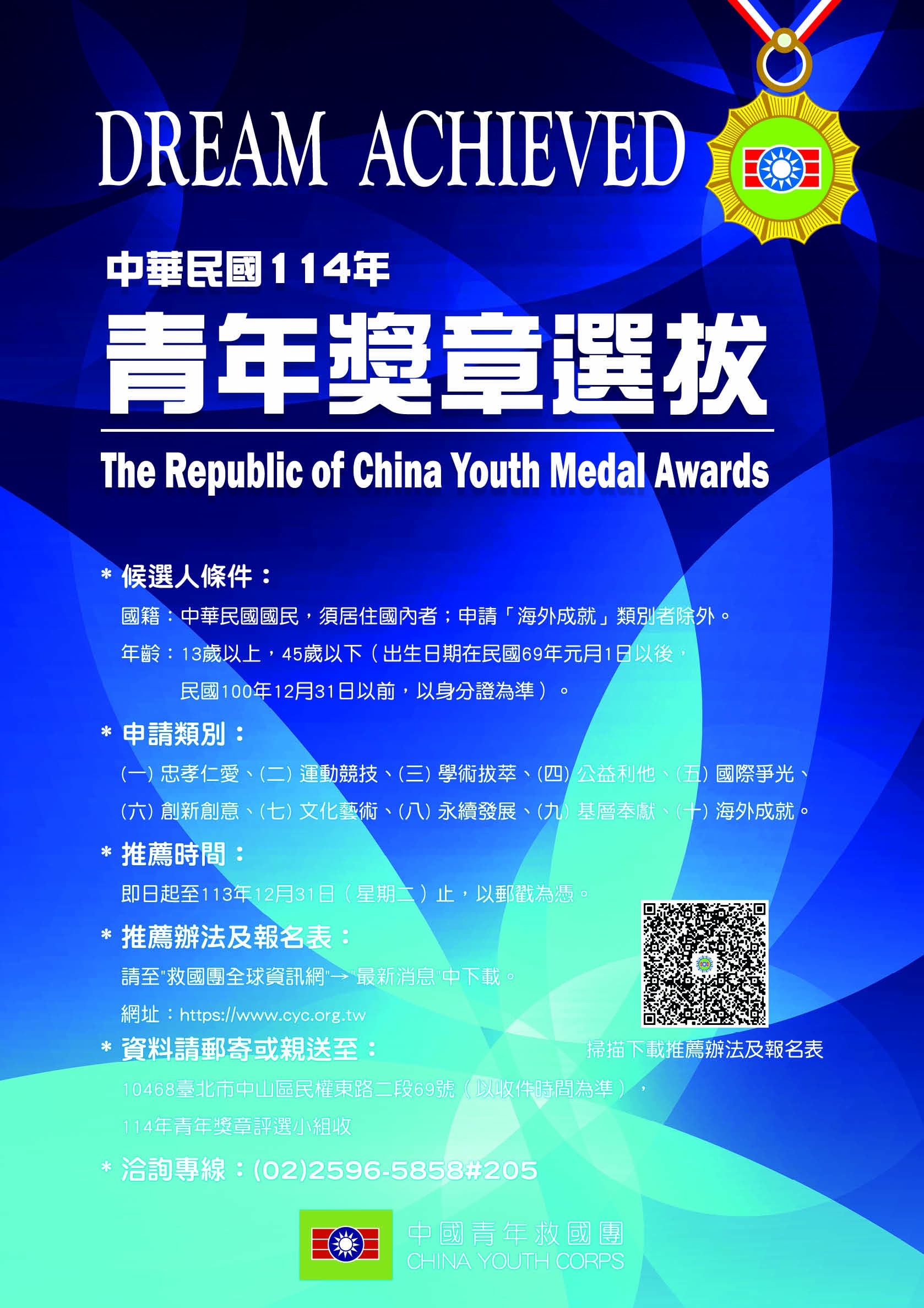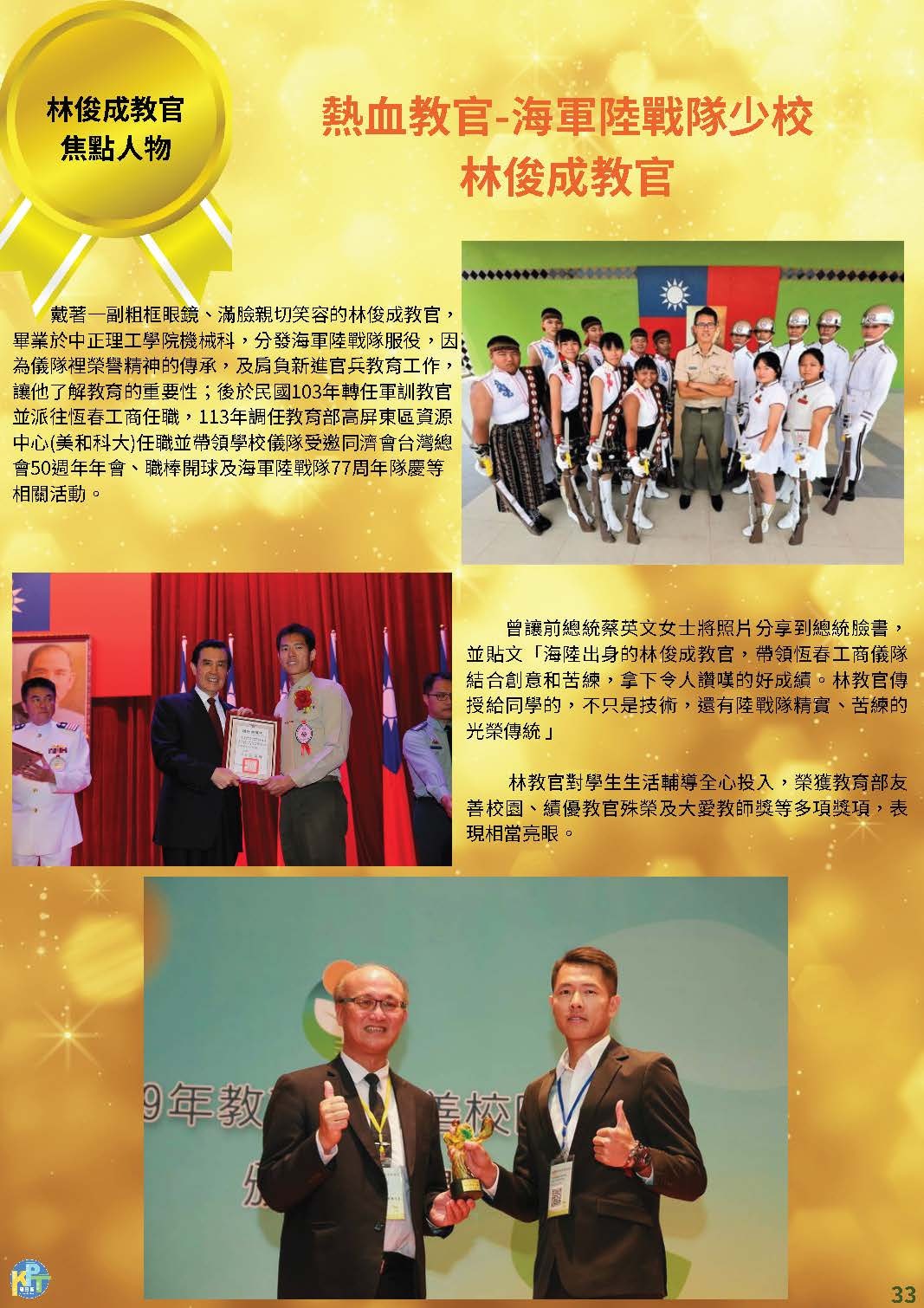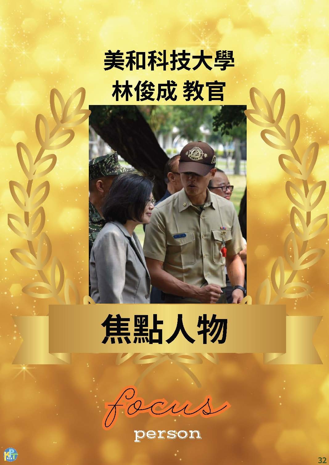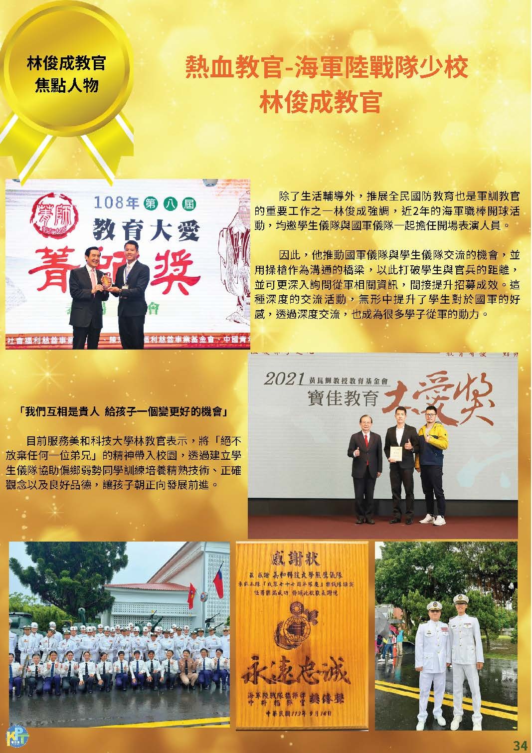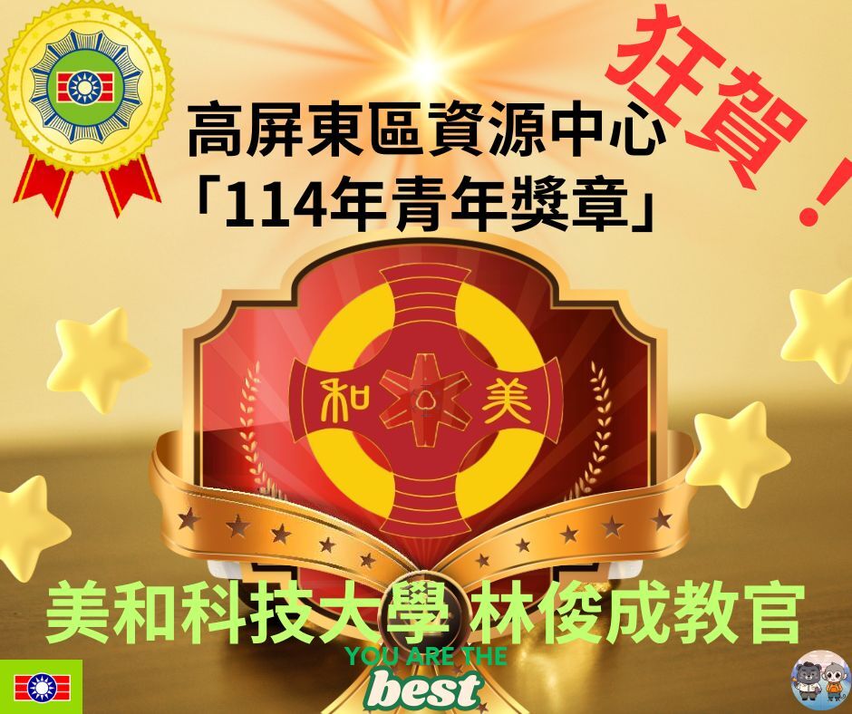 高屏東區資源中心所屬夥伴學校-美和科技大學-少校軍訓教官林俊成榮獲114年度「青年獎章」,林教官創立學生儀隊,帶給學生歸屬感,扮演學生貴人,全心投入教育熱忱,傳遞無私奉獻精神,可謂奉獻國家社會,足為青年楷模;另輔導學生,處理過許多事件,學生回饋更為真實,不論全民國防教育、反毒工作、生活輔導,他在基層默默耕耘奉獻,更視學生改變成長為最大成就,無私投注教育熱忱。![]()