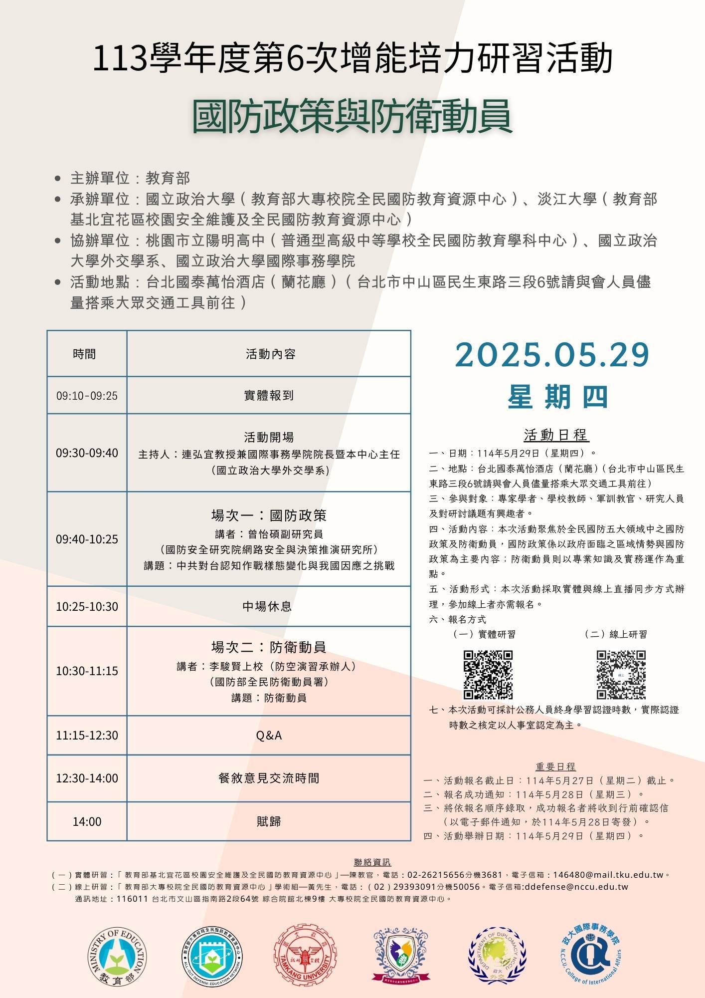 轉發大專校院全民國防教育資源中心「113學年度第6次增能培力研習活動」~~